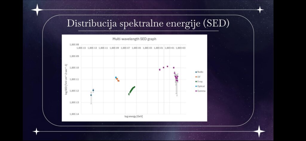 Aktivne galaktičke jezgre su iznimno moćni objekti u Svemiru koji emitiraju zračenje duž čitavog elektromagnetnog spektra. Analizirajući podatke sa raznih svjetksih teleskopa sastavili smo SED graf (distribucija spektralne energije) i uočili prisutnost velike količine energije u UV i gama valnim duljinama što ukazuje na postojanje aktivne galaktičke jezgre i mlaza relativističkih čestica usmjerenog prema nama.