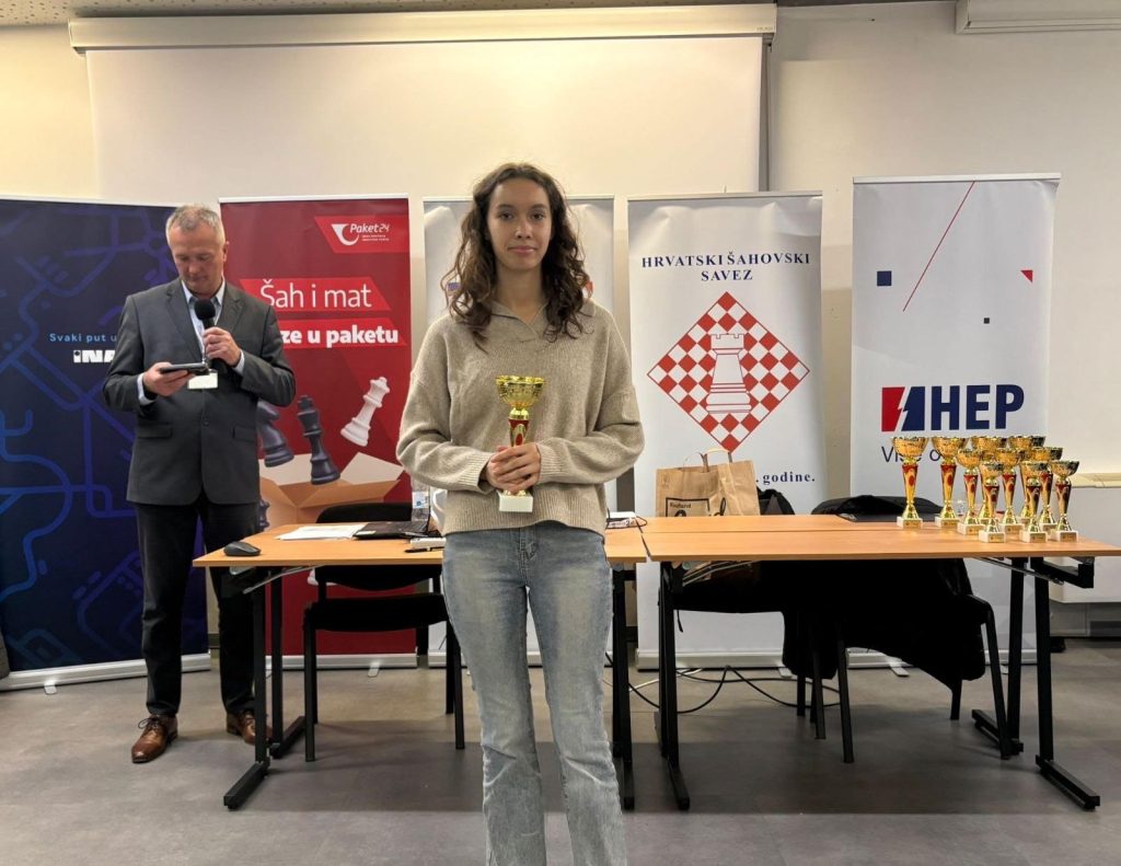 Dunja Udovičić, učenica 1. f razrednog odjela, viceprvakinja je Hrvatske u brzopoteznom šahu u kategoriji Ž16! Uz to, Dunja je ostvarila još jedan sjajan rezultat osvojivši i 3. mjesto u ubrzanom šahu na Prvenstvu Hrvatske održanom u Vodicama od 21. 11. do 23. 11. 2025. Čestitamo Dunji na sjajnim rezultatima i želimo joj još mnogo šahovskih uspjeha!