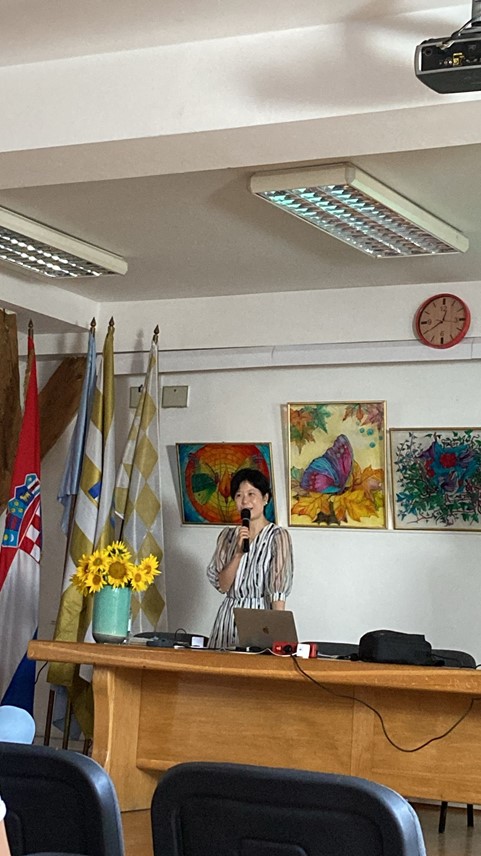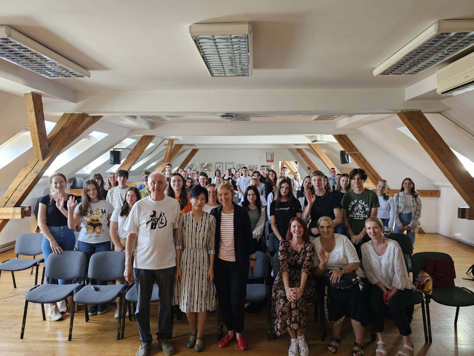 „U petak, 29. rujna 2023. našu je Školu posjetila talentirana japanska pijanistica Yoko Nishii, čija je šarmantna osobnost održala neupitnu pažnju publike. Zanimljivo je napomenuti da ovo nije njen prvi posjet Hrvatskoj, a posebno je dojmljivo da je cijelo predavanje bilo izloženo na hrvatskom jeziku. Njezin predani pristup učenju našeg jezika svjedoči o njezinu dubokom poštovanju prema našoj kulturi. Također, vrijedno je istaknuti da je jedna od njezinih omiljenih skladateljica Dora Pejačević, hrvatska skladateljica rođena u Našicama. Yoko Nishii izvanredna je umjetnica koja, unatoč obavezama diljem svijeta, uvijek rado posjećuje Hrvatsku. Do sada je održala čak 50 solističkih recitala u 24 različita grada širom zemlje. Njezino predavanje zračilo je inspiracijom! Uz to, podijelila je s nama priču o značenju svog imena i općenito važnosti imena, razgovarala o svojim iskustvima u Hrvatskoj, glazbenom putovanju te ljubazno odgovarala na sva naša pitanja. Na kraju, kada je zasvirala na našem već starom klaviru, skladba je zvučala tako svježe i elegantno da je utišala i najmanji šapat u potkrovlju.“